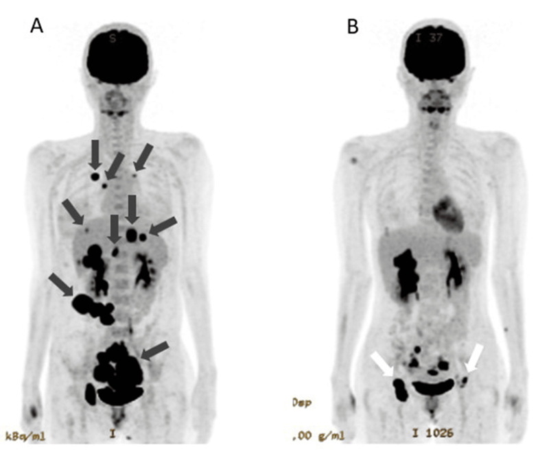 第三次治疗后CEA、CA125指标明显下降,腹围减小,肝转移灶缩小。后续追加两次NK细胞治疗,142天后,PET-CT显示肺转移和腹膜播散消失,原发病灶显著缩小,患者计划进行根治性手术。治疗期间除发热外无其他副作用。